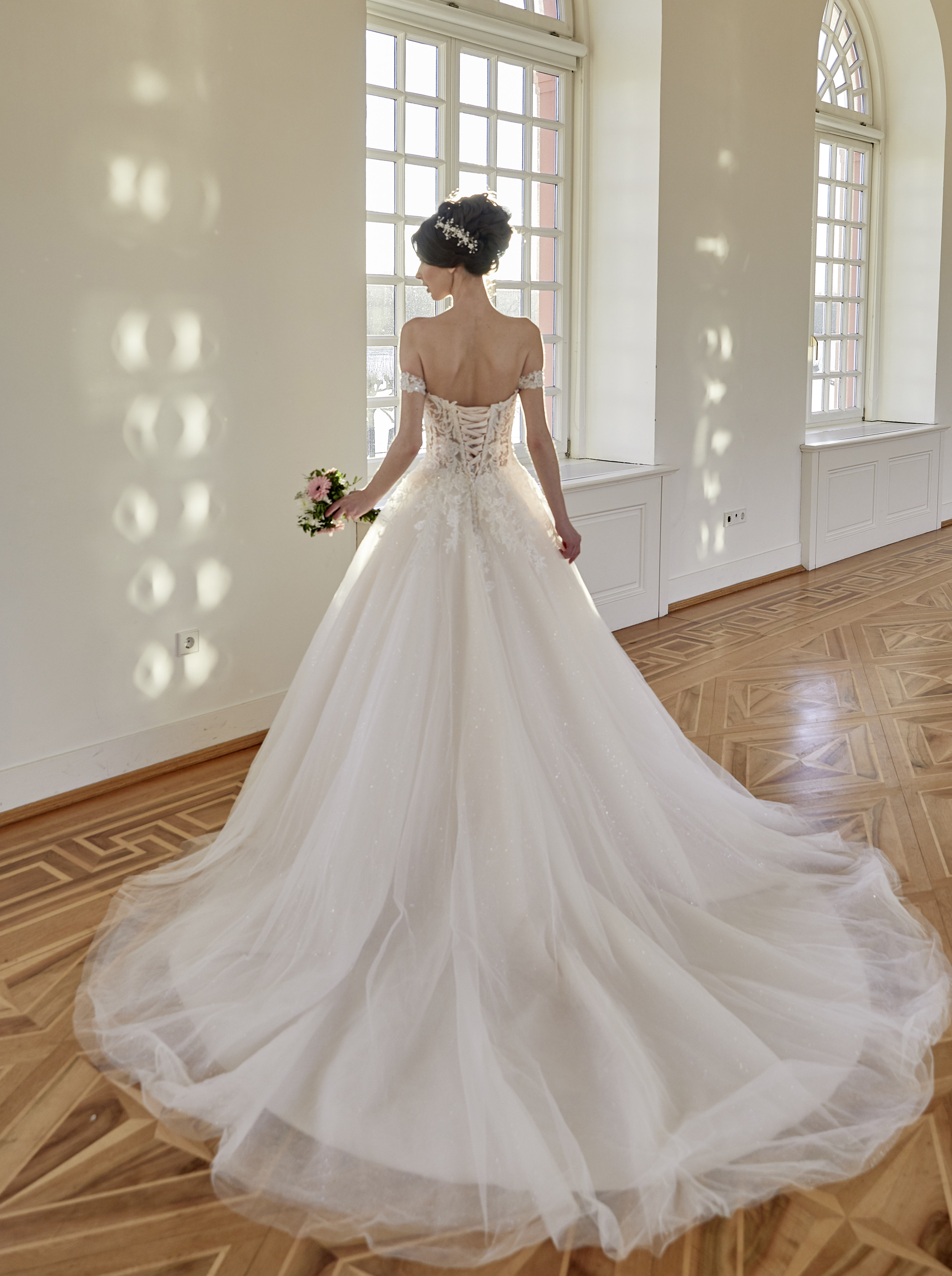 Smuk og romantisk brudekjole med glitterskørt.