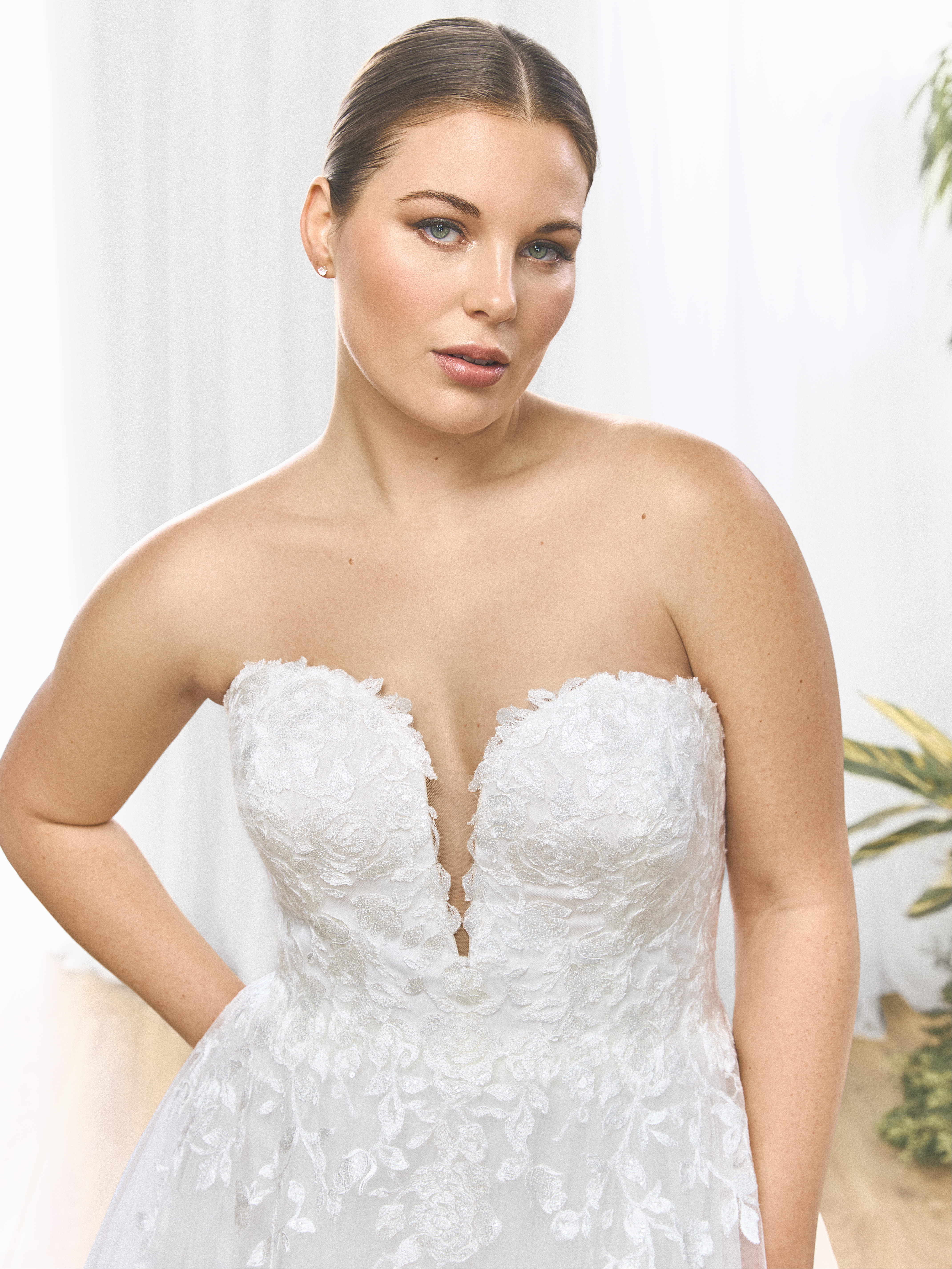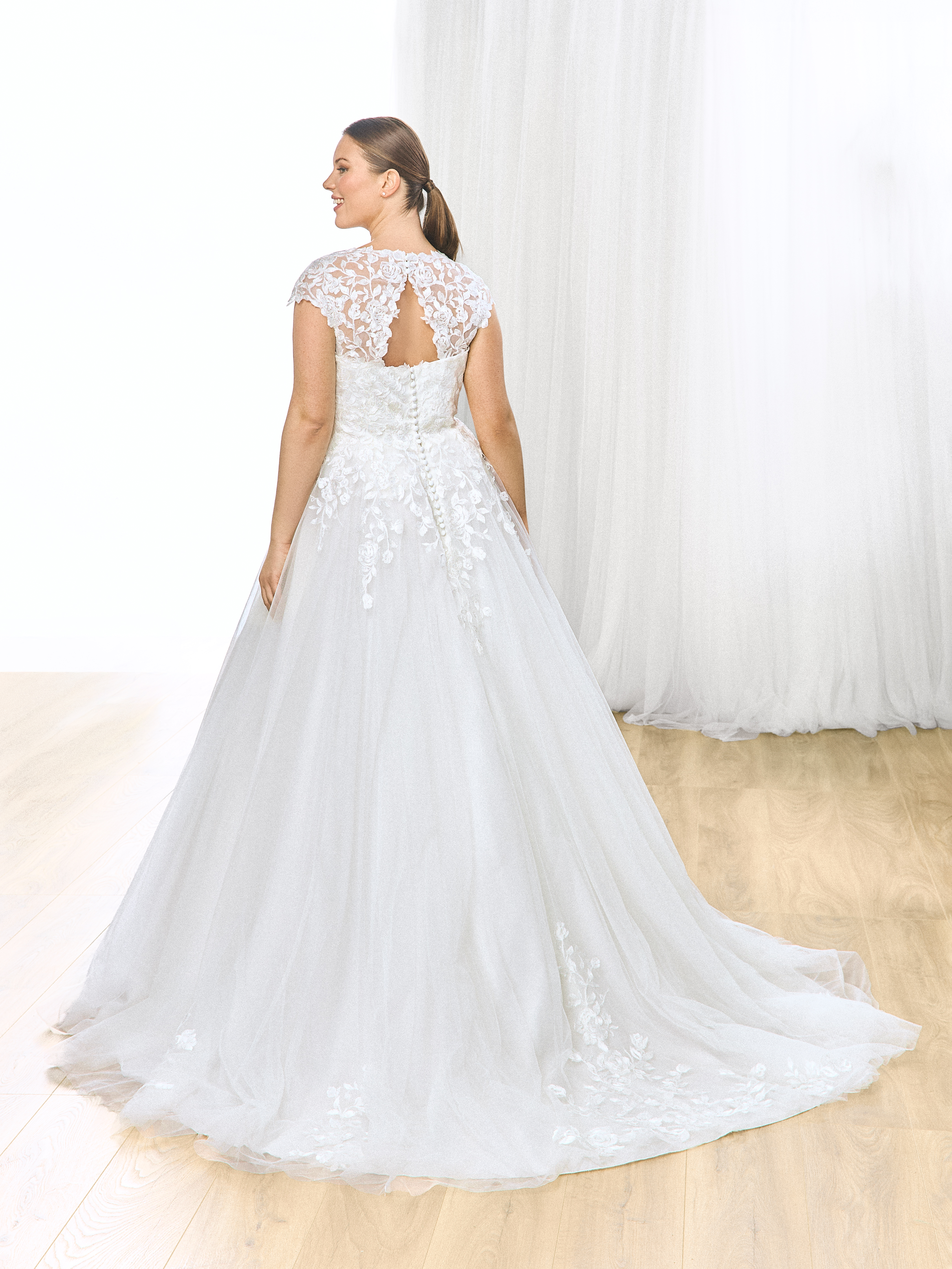 Smukke blonder på overdelen, som løber med ned af skørtet, Blonderne er ligeledes flot placeret i bunden på skørtet, samt på slæbet.
