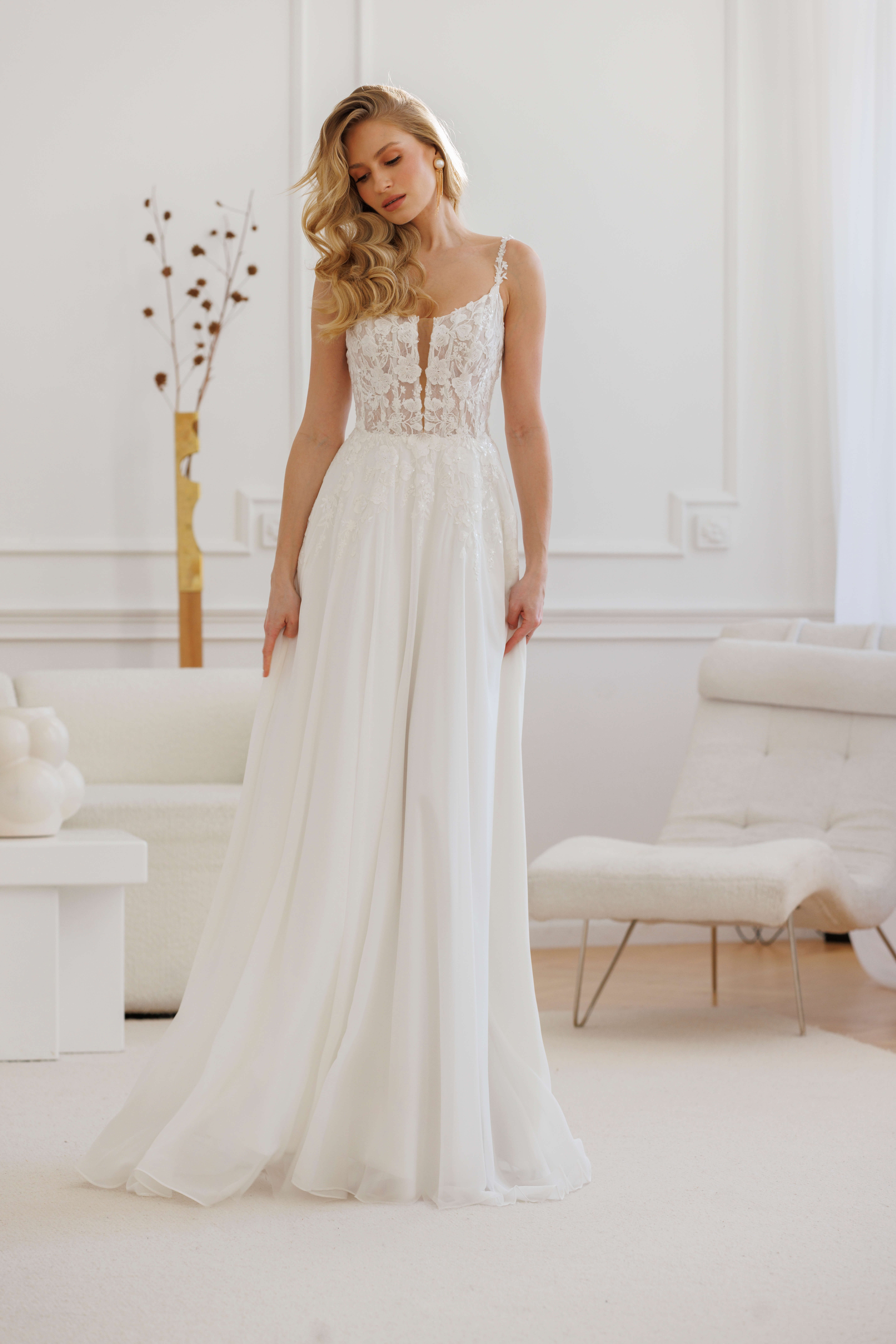 Forfriskende brystudskæring, tynde perlebesatte stropper, det blødeste a-line chiffonskørt og det imponerende slæb. Detaljerne fra overdelen løber med ned på skørtet.