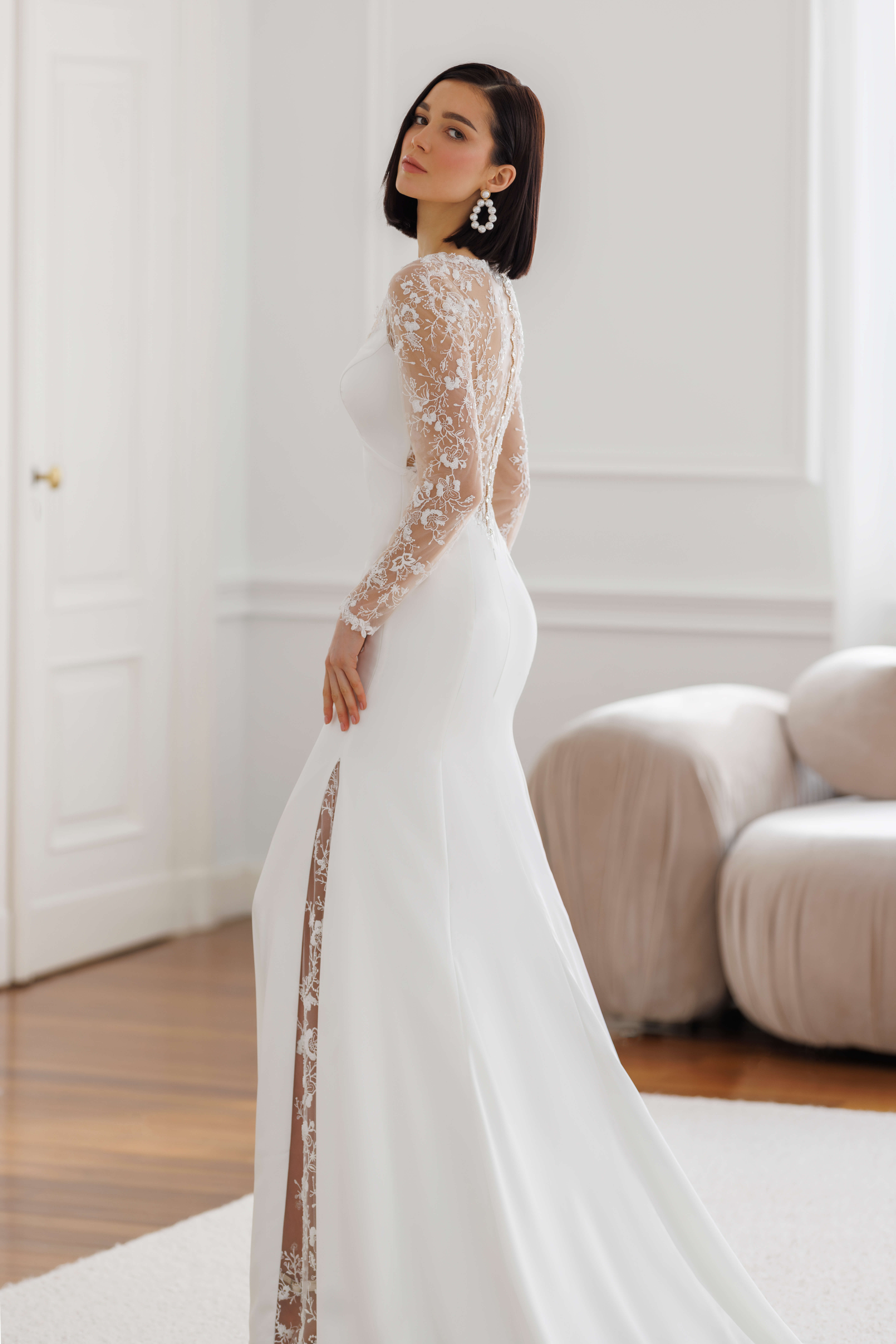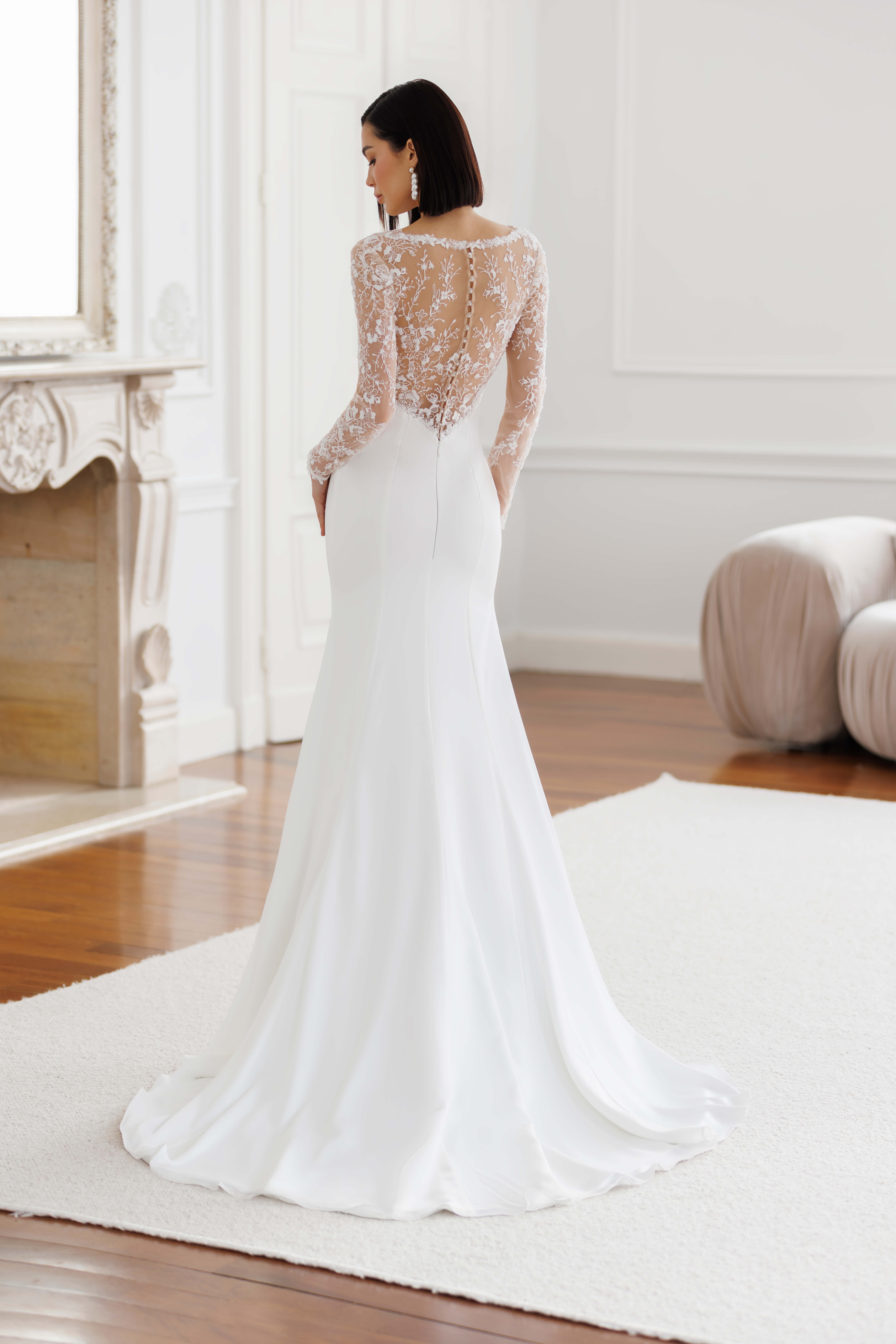Fit'n flair bryllupskjole i satin med lange glitterfyldte ærmer.
