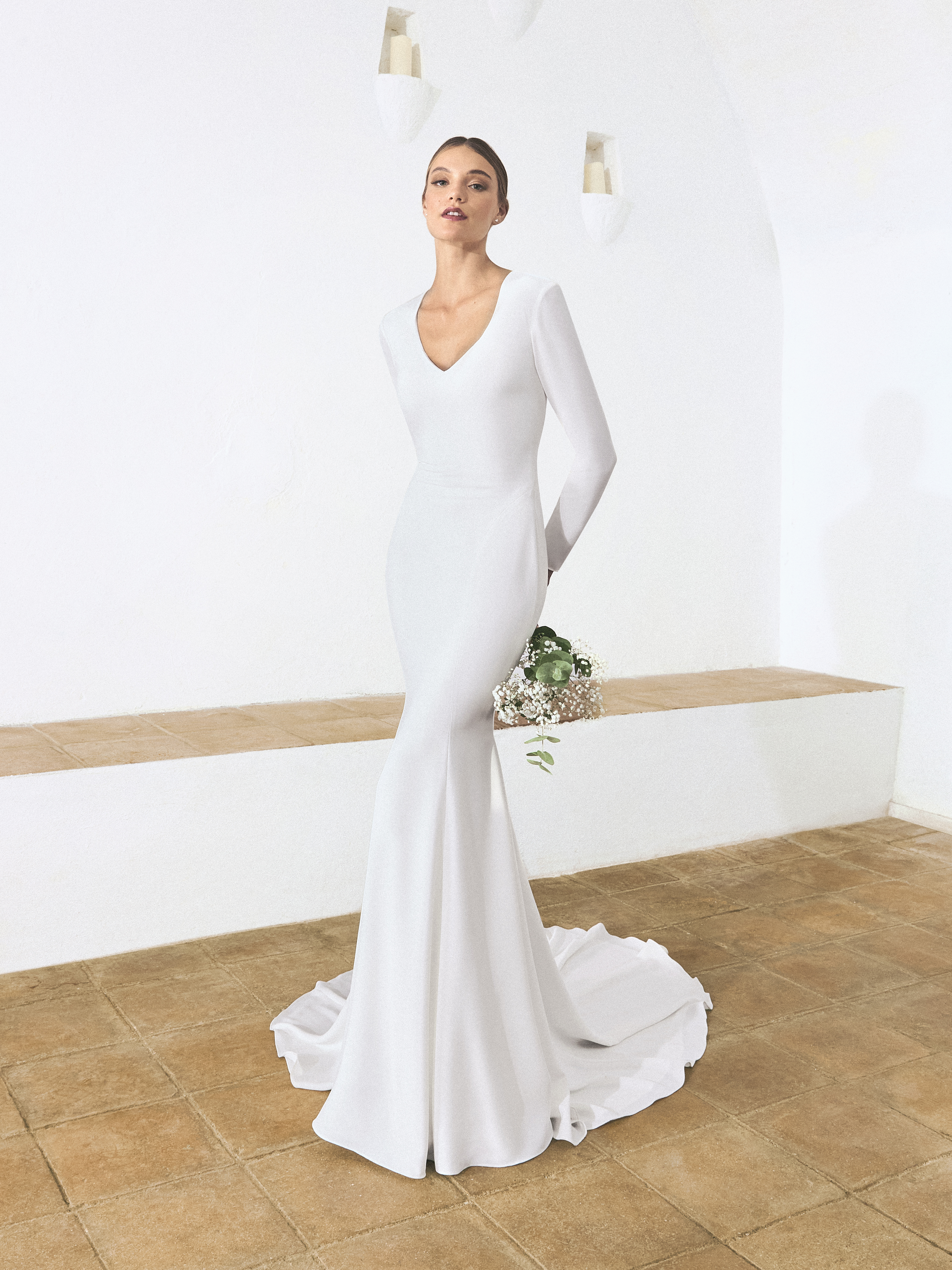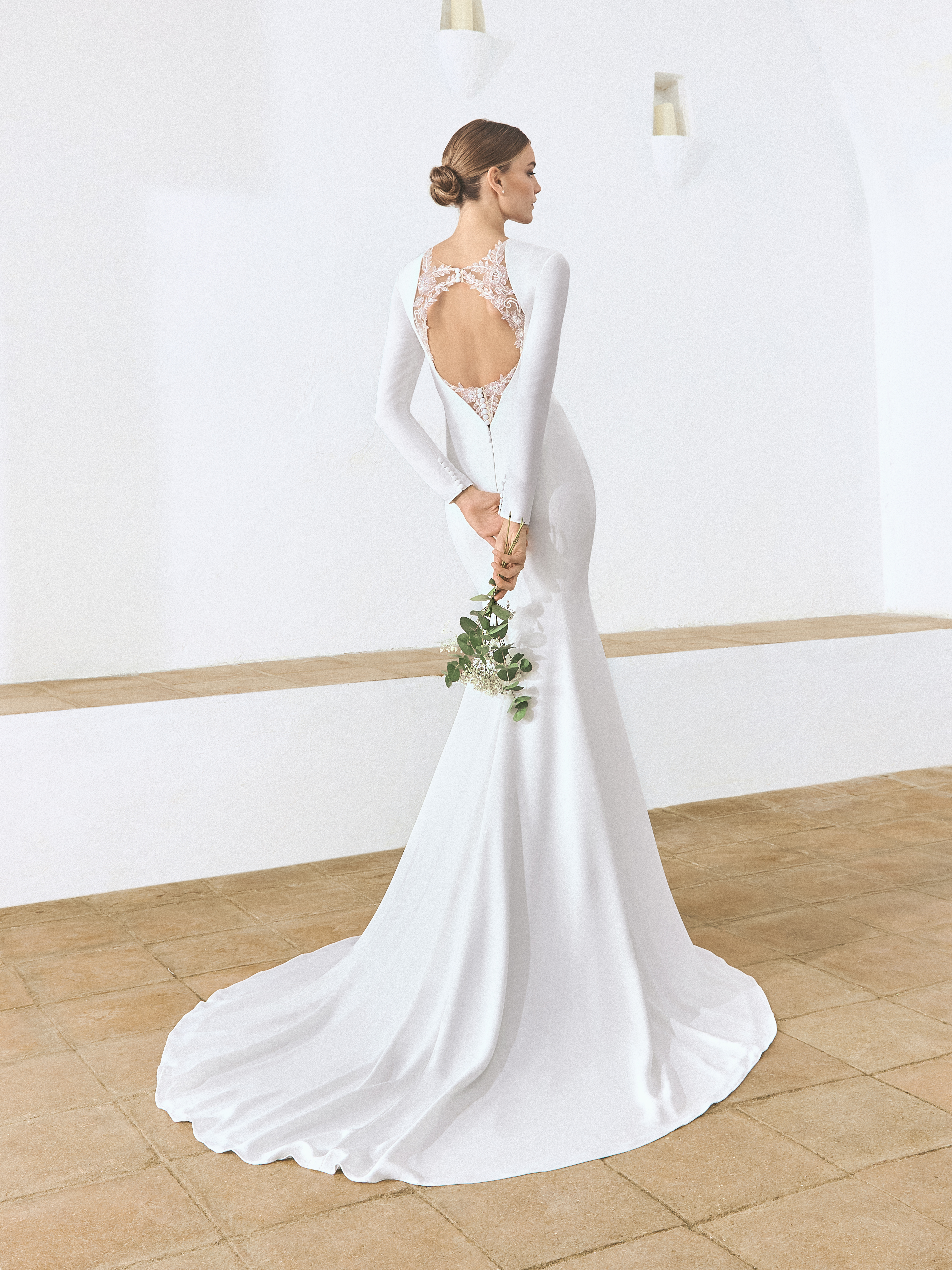 Enkel og stilren tætsiddende brudekjole i crepe, med den smukkeste ryg.