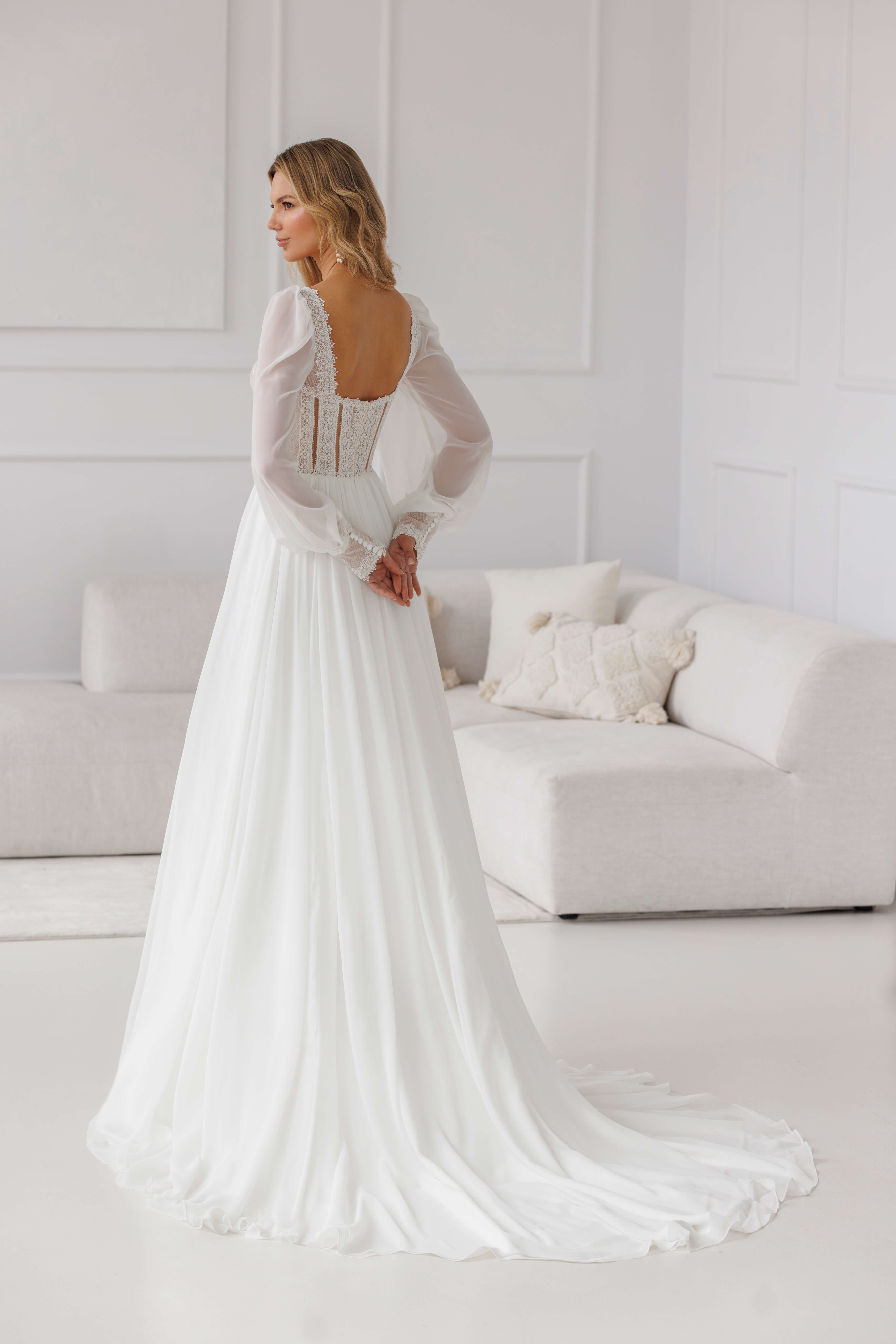 De lange ærmer med balloneffekt samt skørtet, er i blød chiffon.