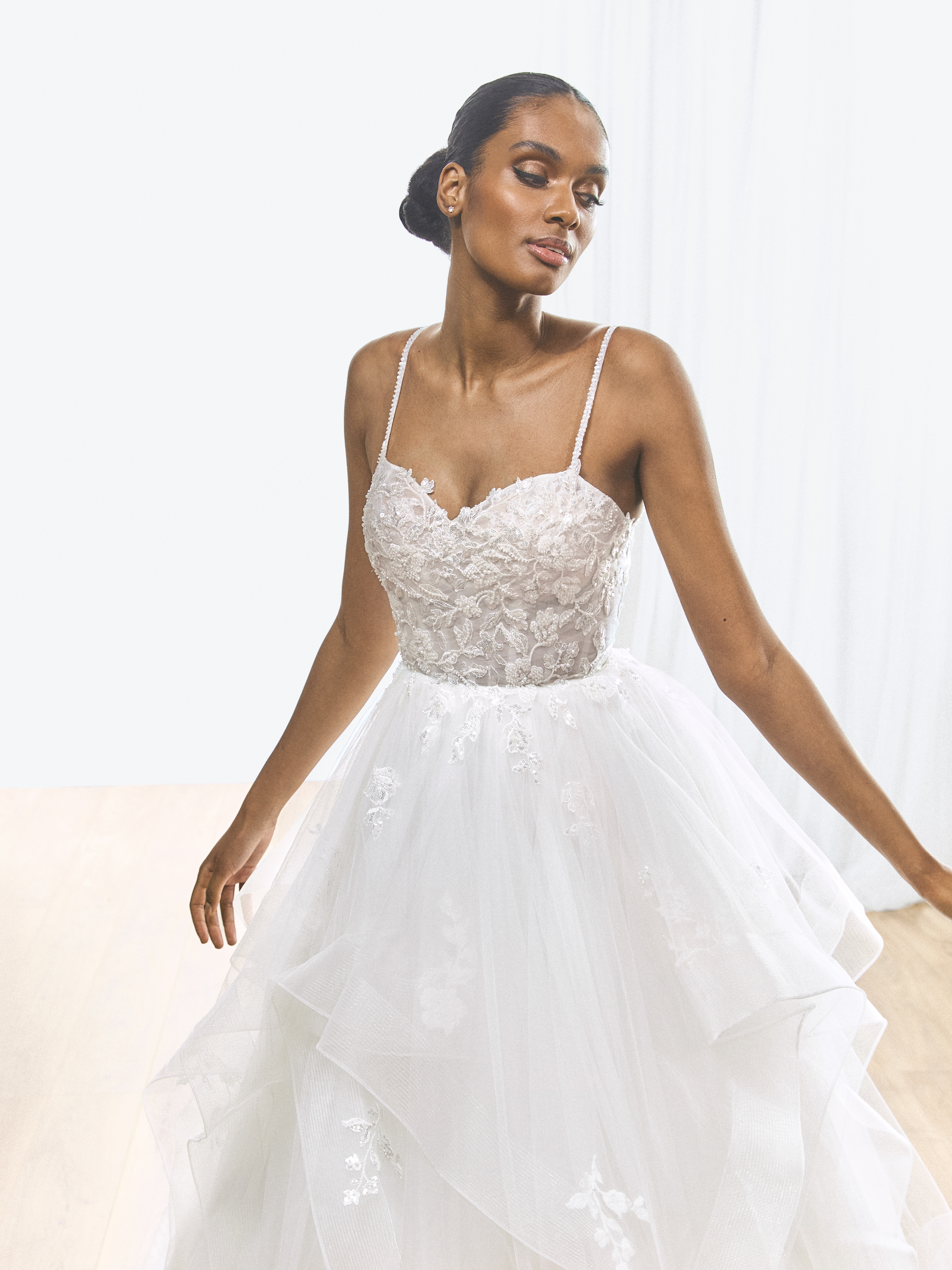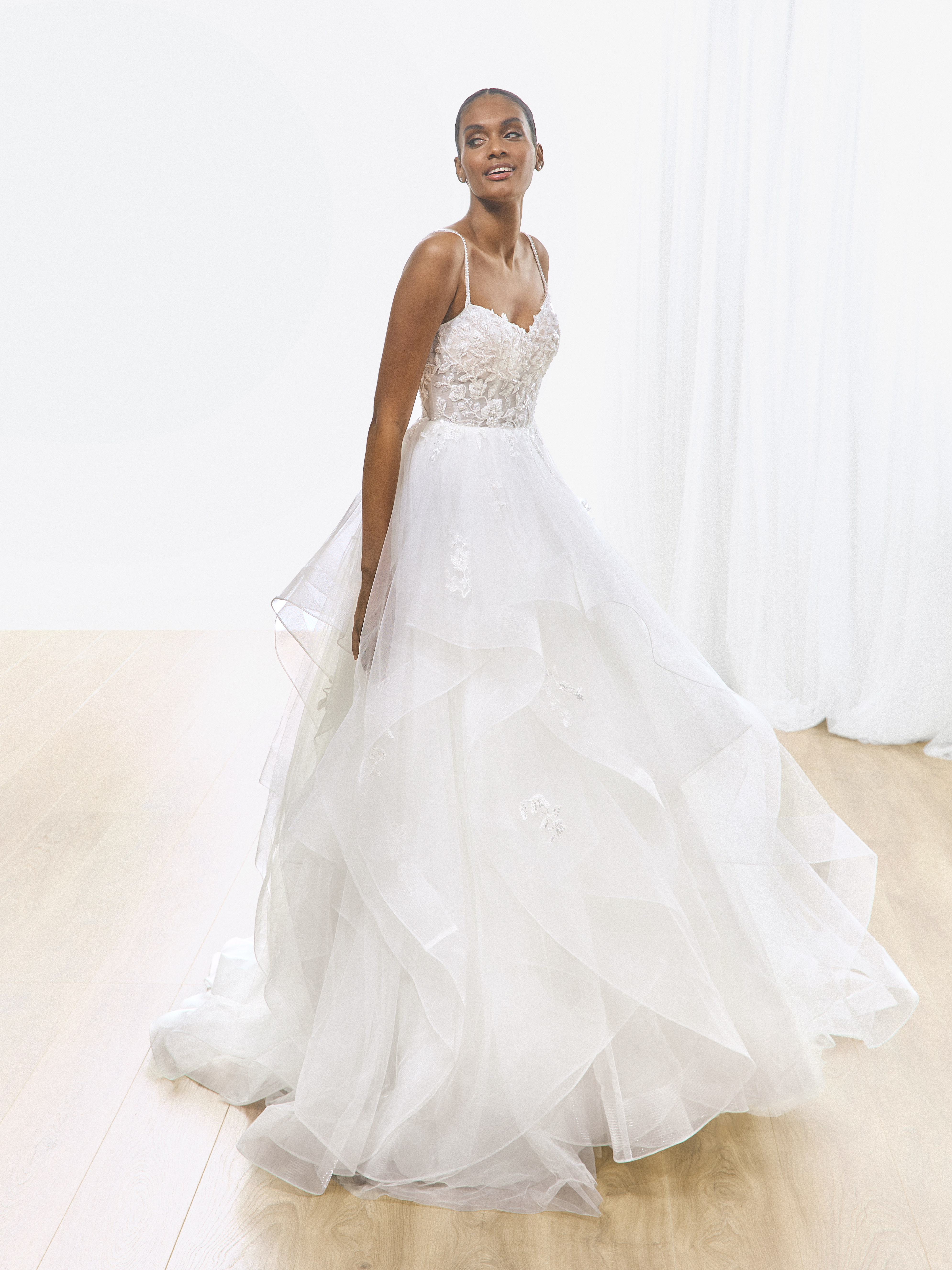 Pompøs og fyldig bryllupskjole med lag-på-lag effekt i tyl.
