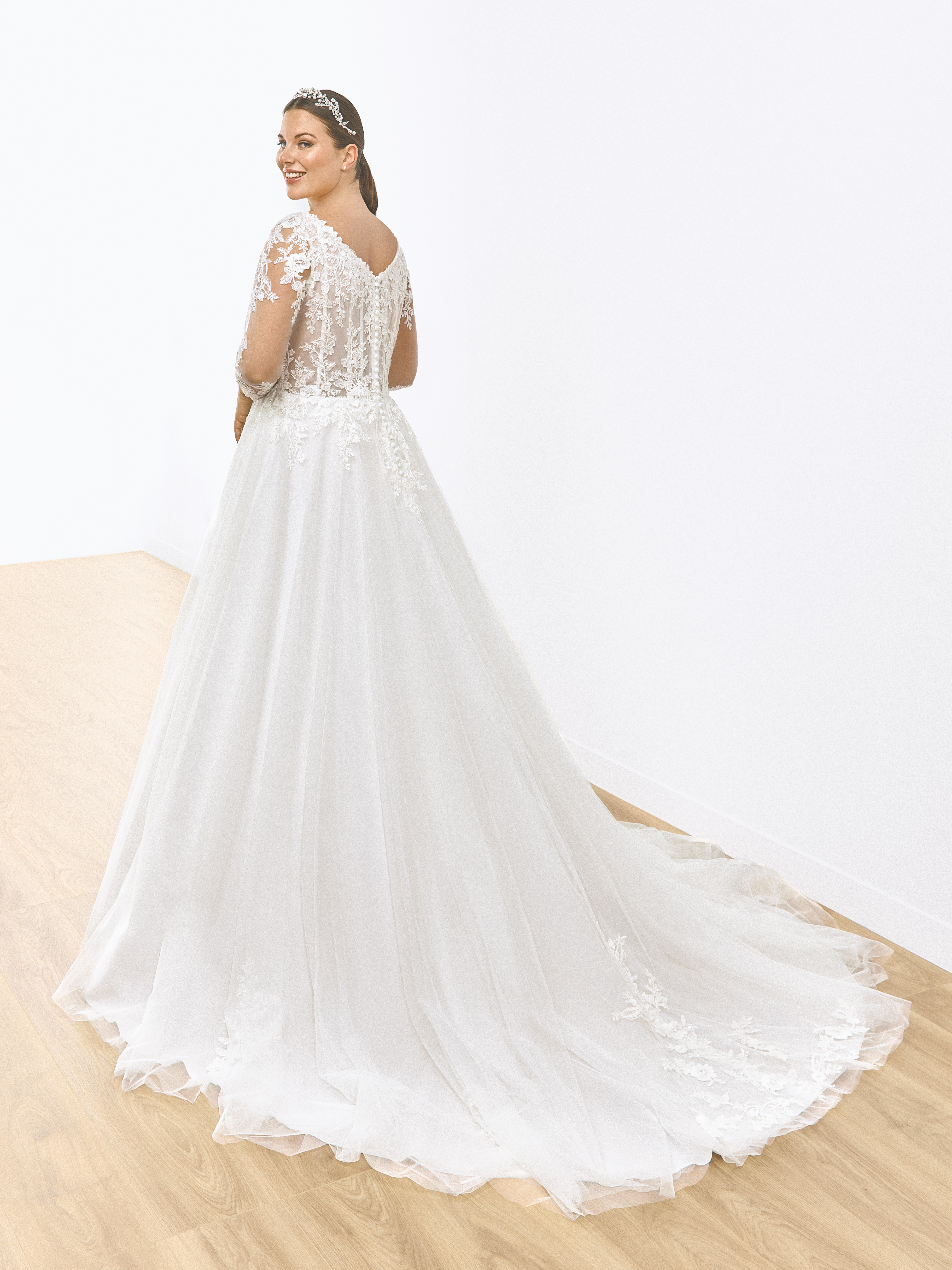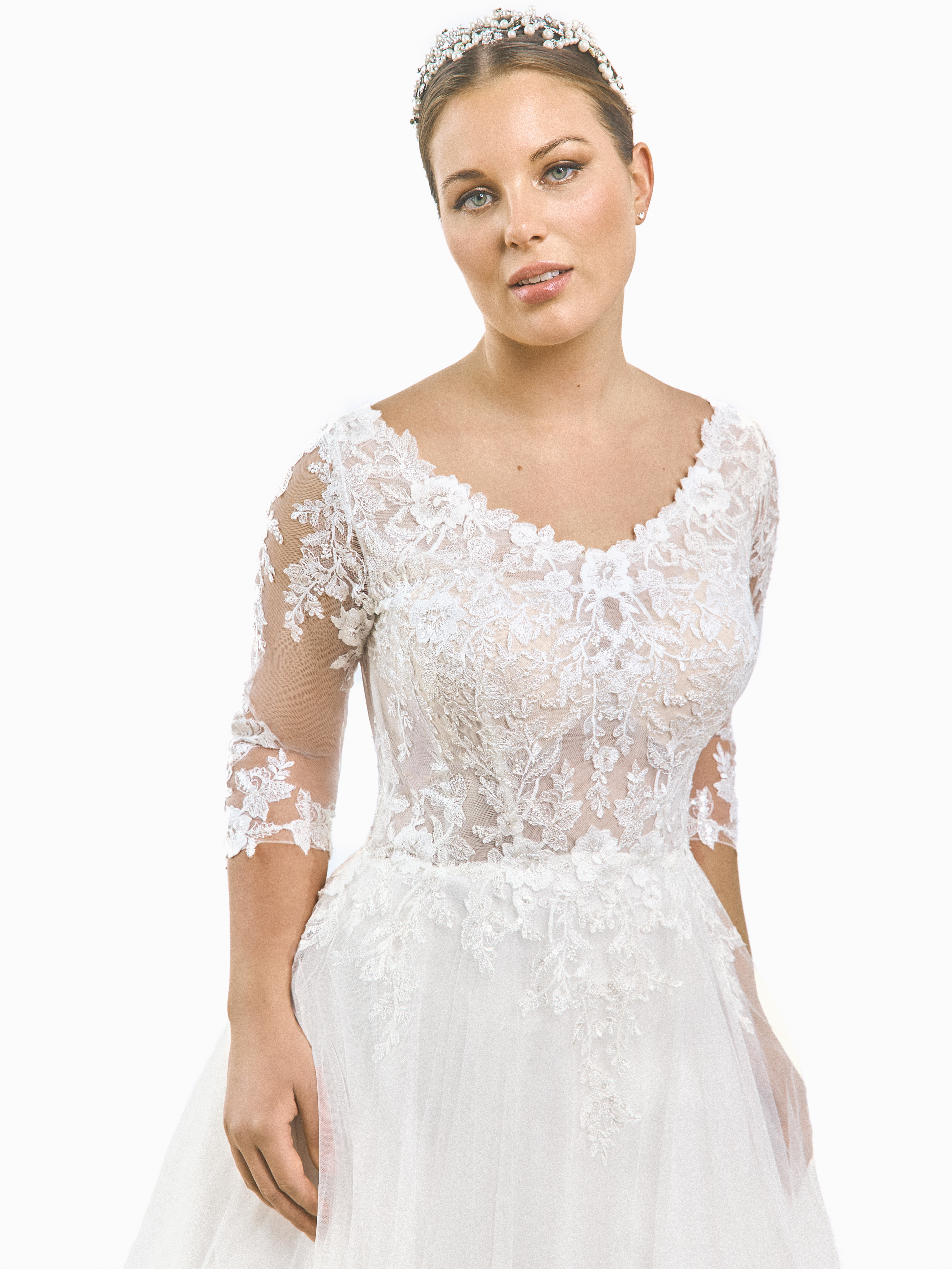 Plus size brudekjole i tyl med 3/4 ærmer.