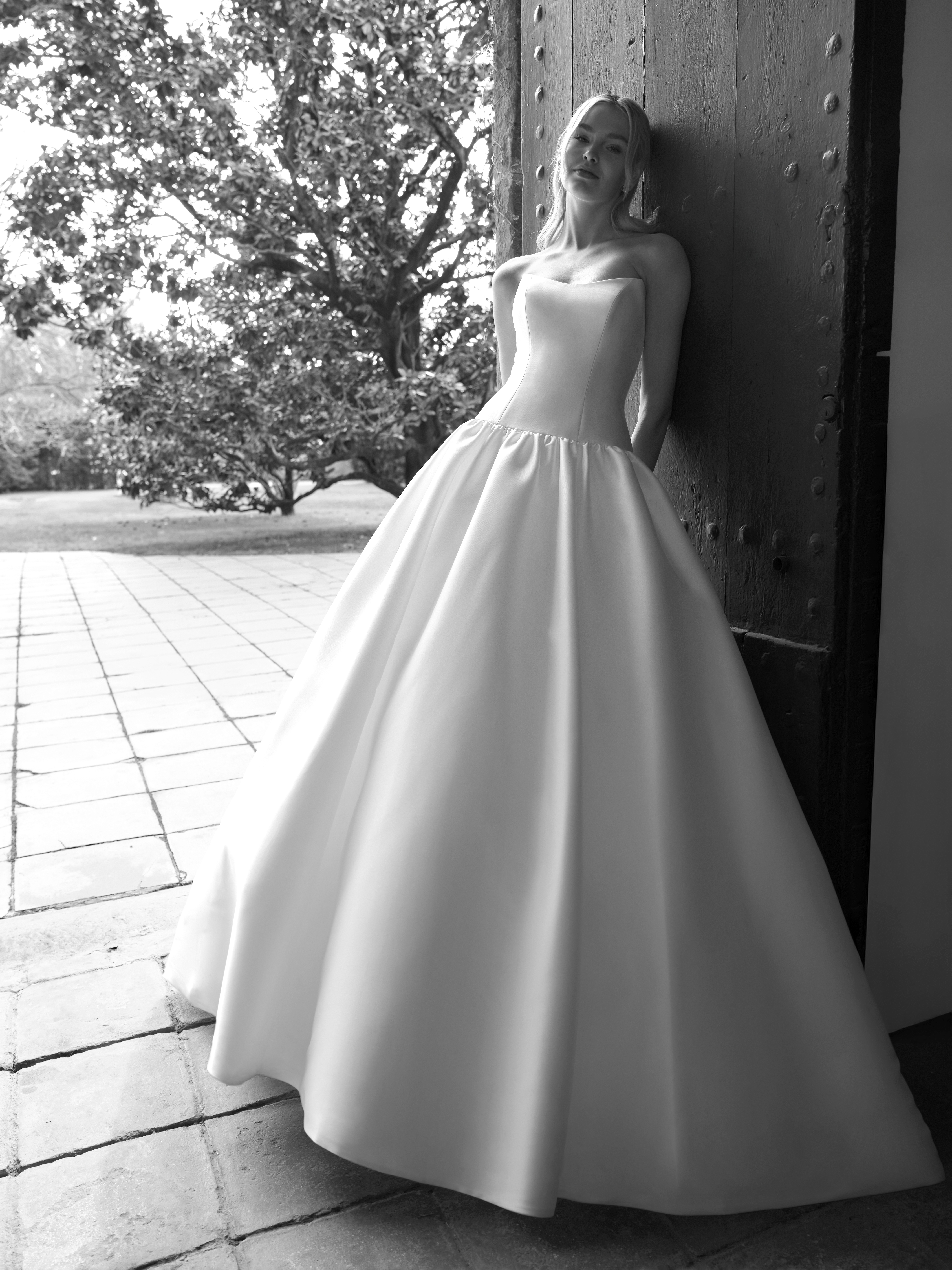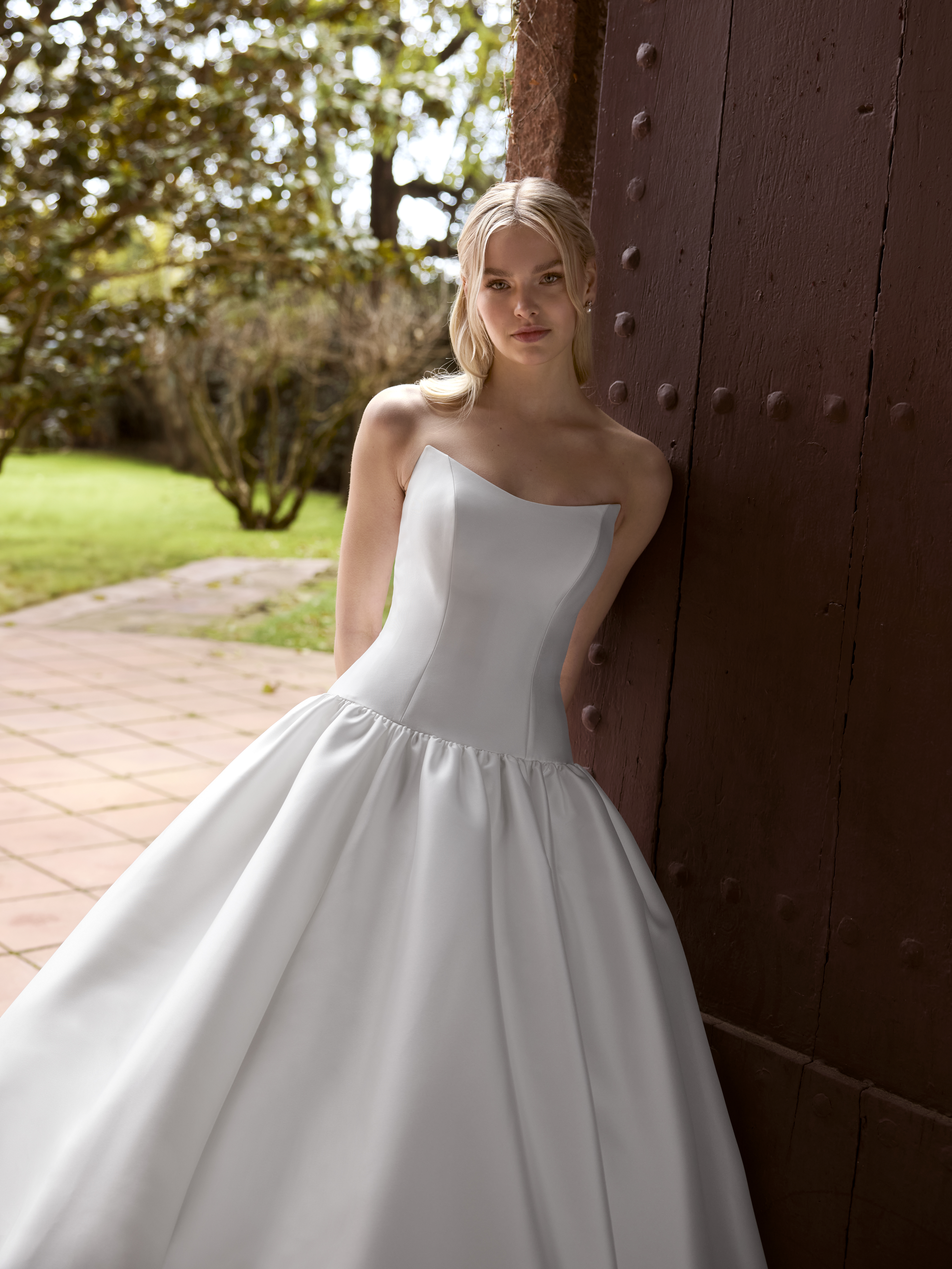 Det fyldige skørt giver royale vibes, men det der gør denne bryllupskjole unik, er den lave taljeskæring. Fremhæver timeglas figuren.